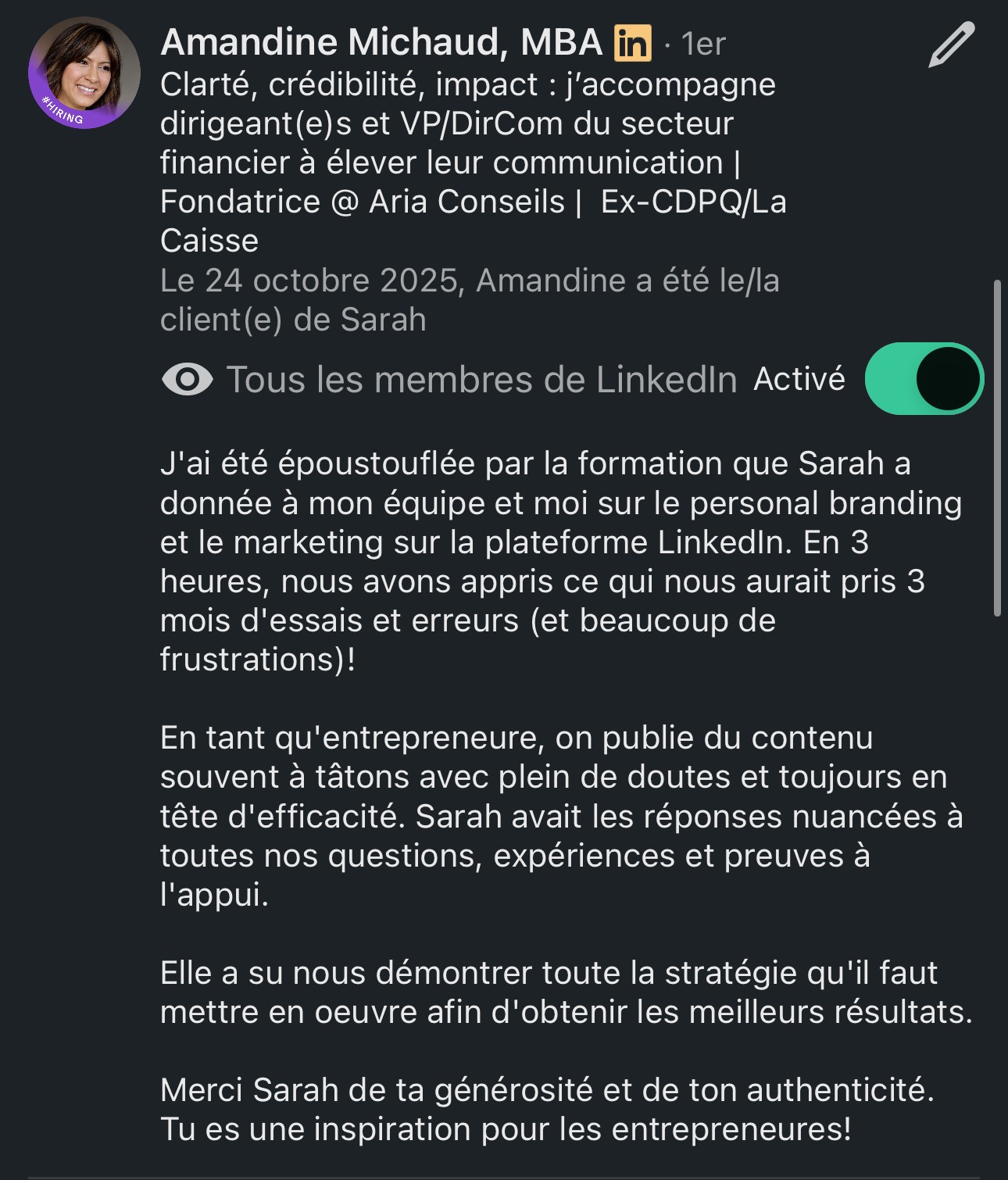 Franchement, merci Sarah! Suite à la formation et à tes généreux conseils, mon profil LinkedIn a triplé de vue et je me fais approcher de plus en plus! J’ai mis en application tes recommandations et aujourd’hui je n’ai plus peur de partager sur les réseaux sociaux et de prendre ma place.