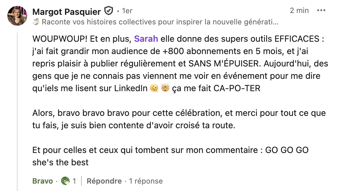J'ai eu l'occasion de travailler avec Sarah pour développer ma visibilité sur LinkedIn. L'échange était vraiment agréable. Souriante. Chaleureuse. Dynamique. Et surprise ! En mettant en pratique 2 de ses astuces, j'ai doublé ma visibilité. Je compte donc reprendre les notes de notre appel et tout mettre en action.