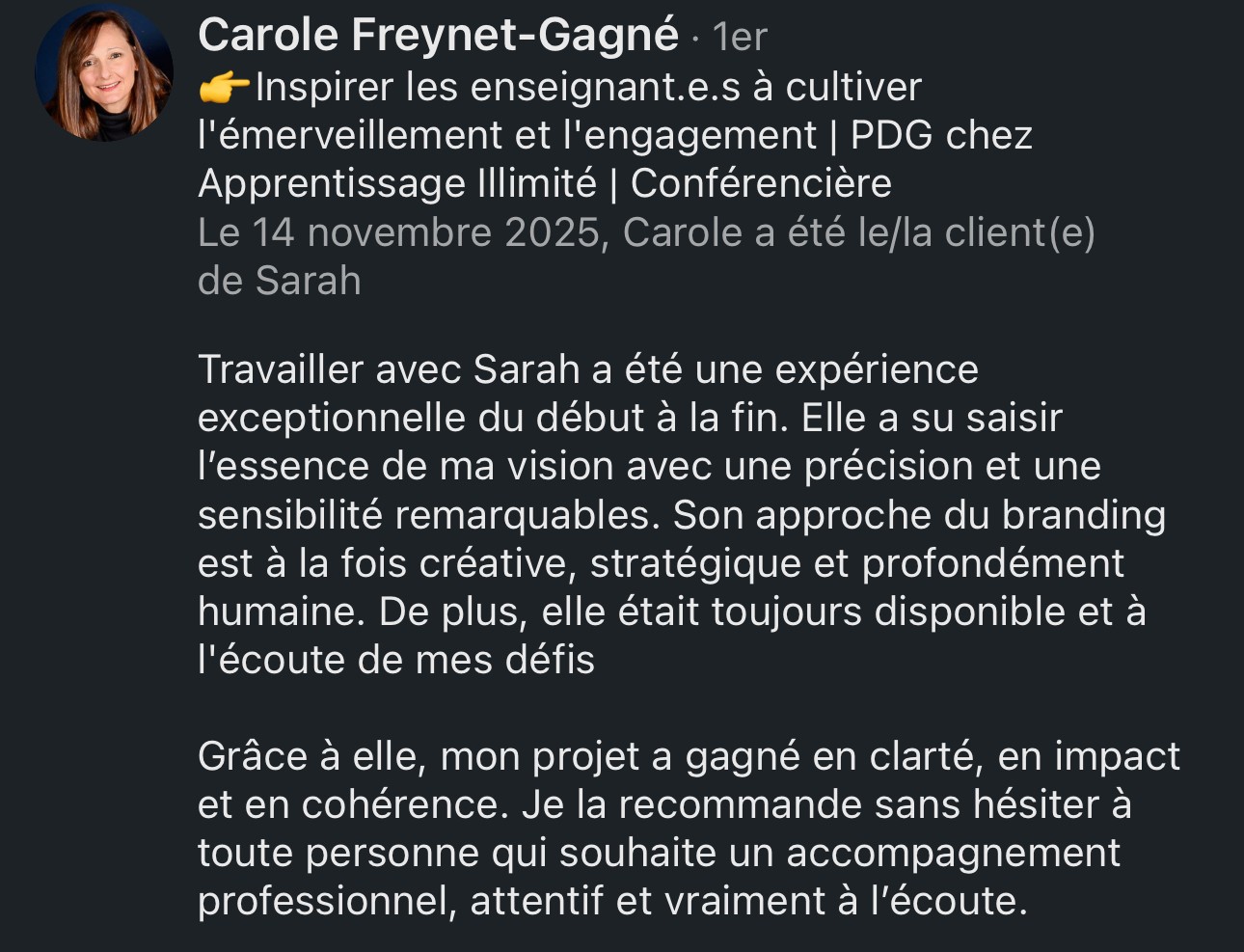 Une méthodologie qui fonctionne! Sarah a su répondre à mes besoins en branding personnel sur LinkedIn. Elle a su m’accompagner dans l’élaboration d’une stratégie à la fois réaliste et ambitieuse. Son suivi est exceptionnel et ses produits efficaces. Une bonne référence pour mettre votre stratégie Linkedin sur les rails.